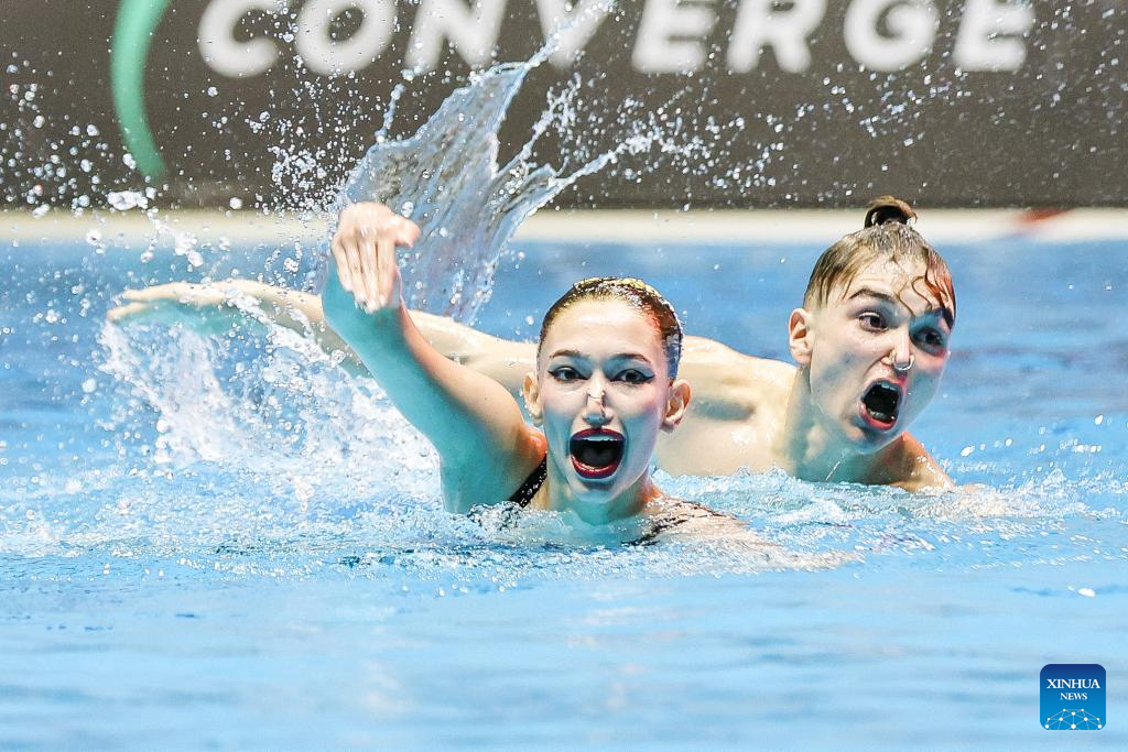 Valeriya Stolbunova (L)/Artur Maidanov of Kazakhstan perform during the junior mixed duet technical final of artistic swimming at the 11th Asian Age Group Aquatics Championships in New Clark City, Capas of Tarlac Province, the Philippines, March 3, 2024. (Xinhua/Rouelle Umali)