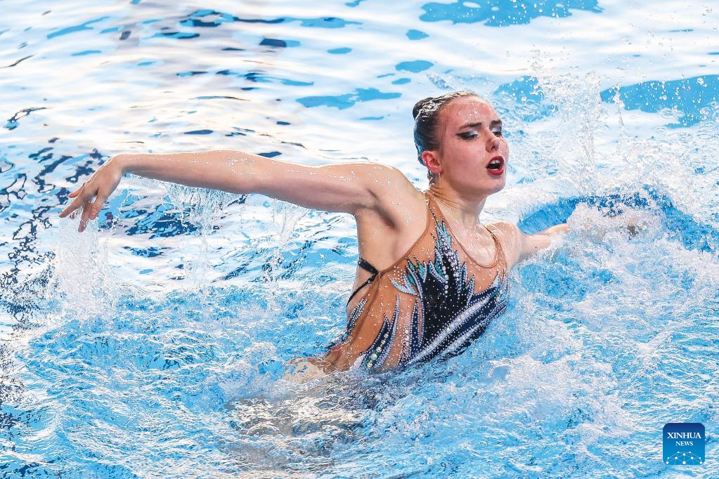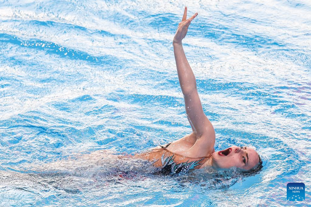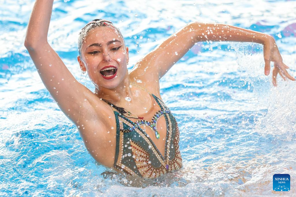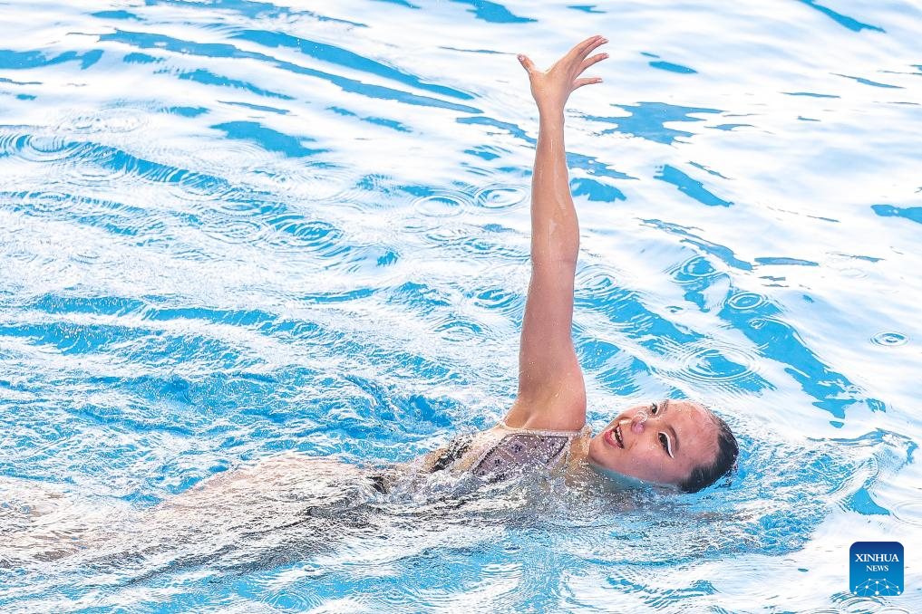 Karina Magrupova of Kazakhstan performs during the junior technical solo final of artistic swimming at the 11th Asian Age Group Aquatics Championships in New Clark City, Capas of Tarlac Province, the Philippines, March 3, 2024. (Xinhua/Rouelle Umali)