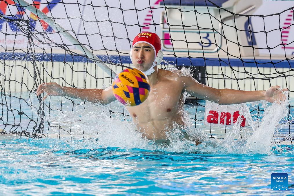 Zhang Yiwen of China makes a save against Japan during the men's water polo round robin Group A match in the 11th Asian Age Group Aquatics Championships in New Clark City, Capas of Tarlac Province, the Philippines, March 3, 2024. (Xinhua/Rouelle Umali)