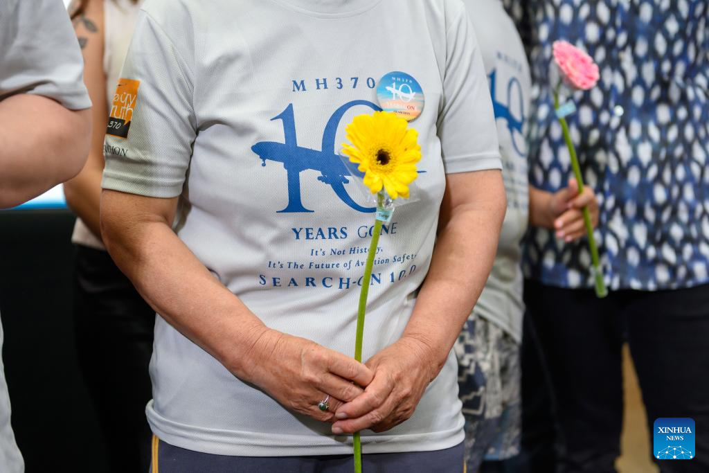 People hold flowers at an event marking the tenth year since the disappearance of the MH370 in Subang Jaya, Selangor state, Malaysia, March 3, 2024. (Photo by Chong Voon Chung/Xinhua)