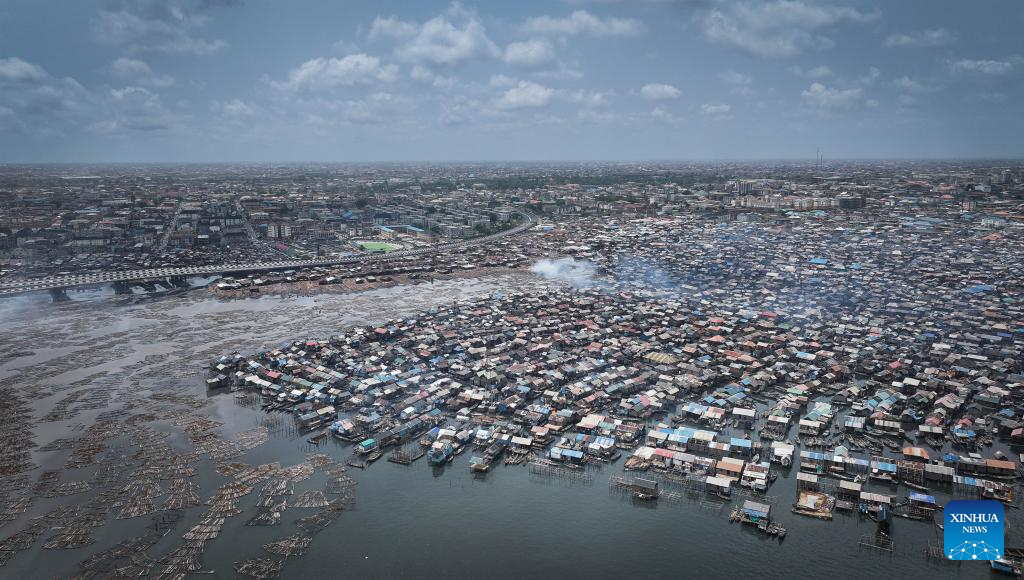 This aerial drone photo taken on March 2, 2024 shows a view of the Makoko floating slum in Lagos, Nigeria. (Xinhua/Han Xu)
