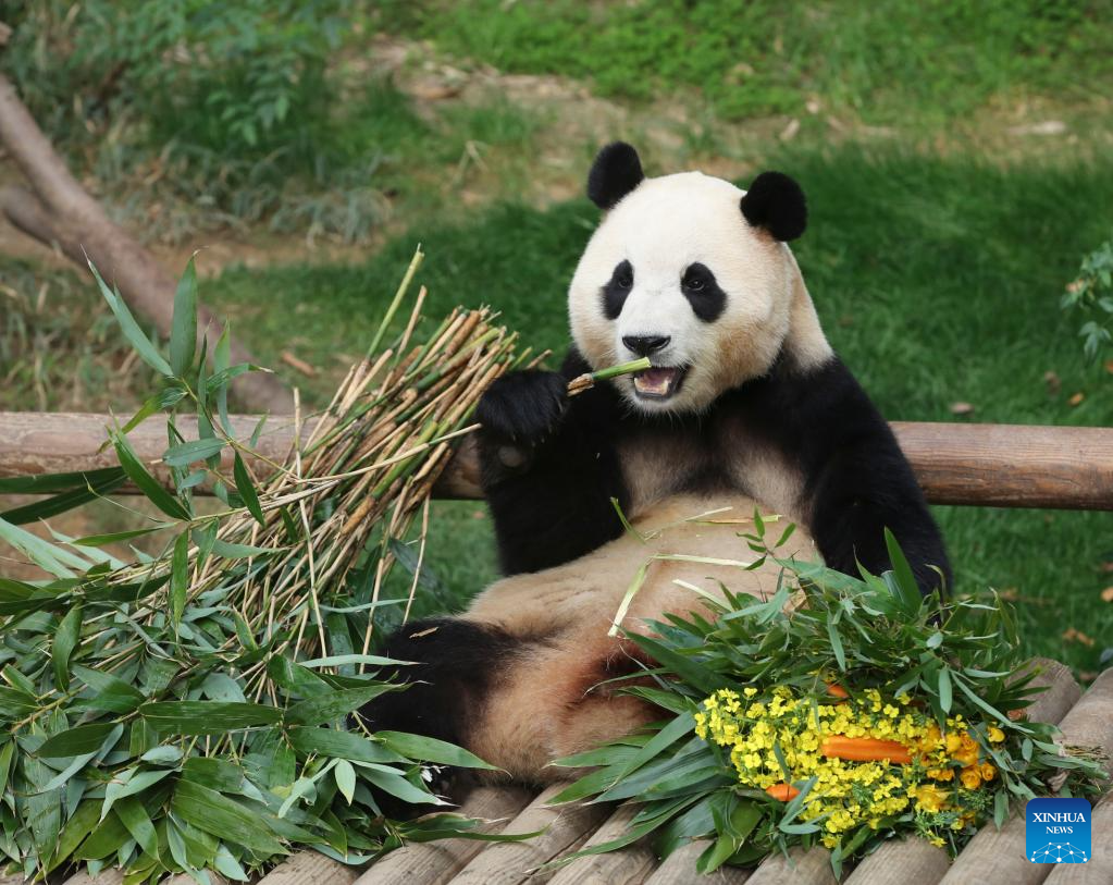 Giant panda Fu Bao eats food at Everland theme park in Yongin, South Korea, March 3, 2024. Fu Bao is scheduled to return to China in April. (Xinhua/Yao Qilin)