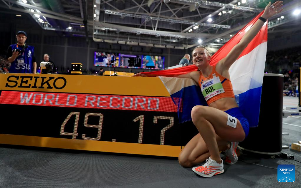 Femke Bol of the Netherlands poses after claiming the title and setting a new world indoor record in the women's 400 meters event at the 2024 World Athletics Indoor Championships in Glasgow, Britain, March 2, 2024. (Xinhua/Li Ying)
