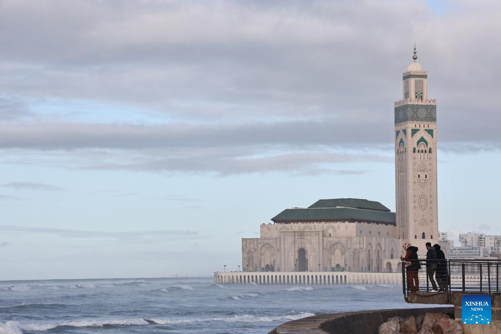 This photo taken on March 3, 2024 shows a view of the Hassan II Mosque, a tourist attraction in Casablanca, Morocco. Casablanca is the largest city in Morocco and the country's economic center and transportation hub. (Xinhua/Huo Jing)