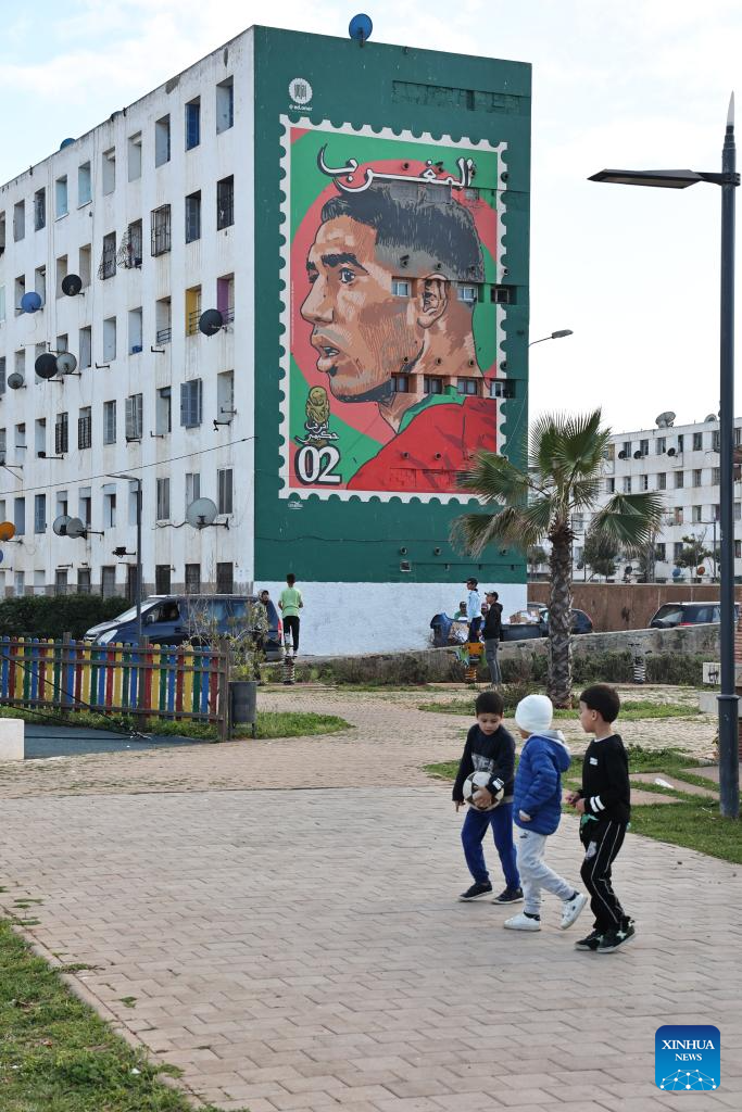 This photo taken on March 3, 2024 shows children playing football near a wall-painting of Achraf Hakimi, Moroccan National Football team's leading star, in Casablanca, Morocco. Casablanca is the largest city in Morocco and the country's economic center and transportation hub. (Xinhua/Huo Jing)