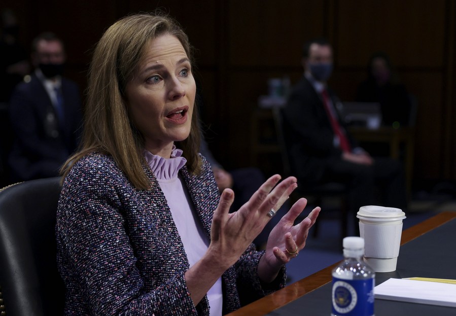 U.S. Supreme Court nominee Amy Coney Barrett attends her confirmation hearing before the Senate Judiciary Committee on Capitol Hill in Washington, D.C., the United States, on Oct. 14, 2020. (Jonathan Ernst/Pool via Xinhua)