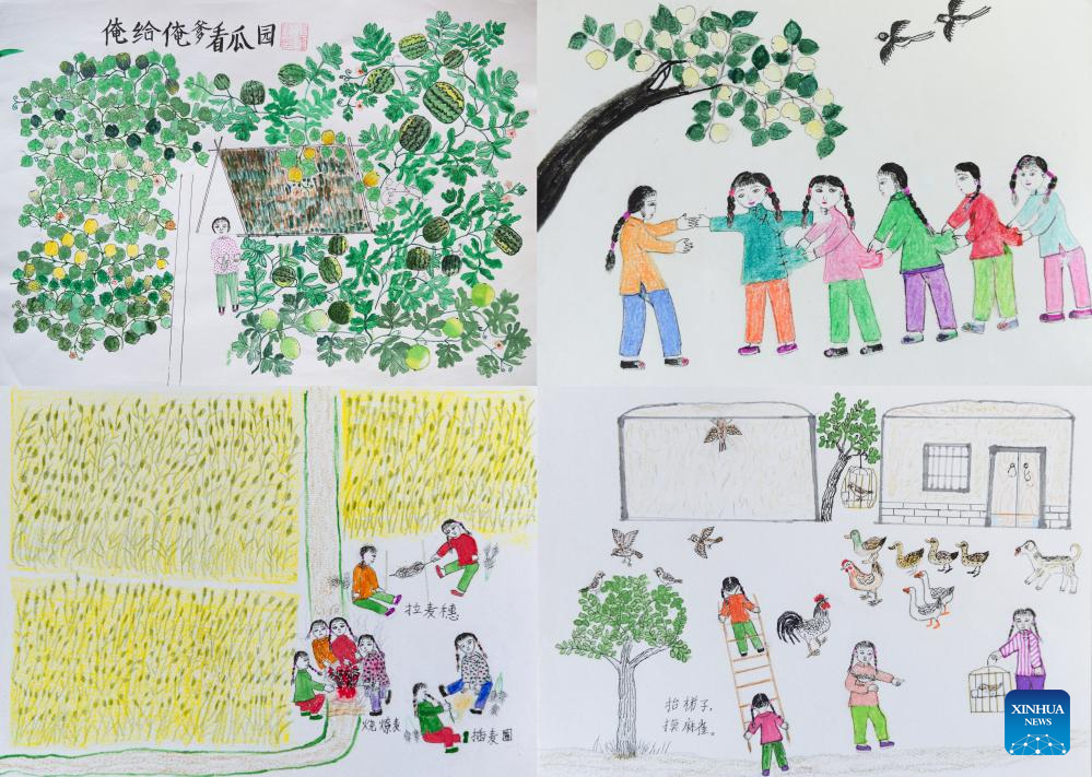 This combo photo taken on March 6, 2024 shows paintings of Jiang Shumei in Beilin District of Suihua City, northeast China's Heilongjiang Province.(Xinhua/Xie Jianfei)