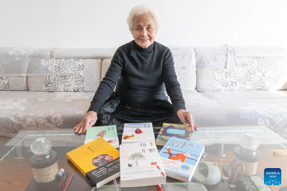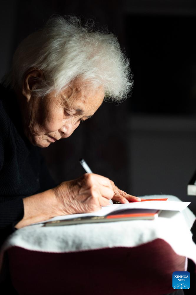 Keeping writing, doing exercises and eating a healthy diet, Jiang maintains regular and good habits, "I will strive to live to 130 years old," she said. (Xinhua/Xie Jianfei)