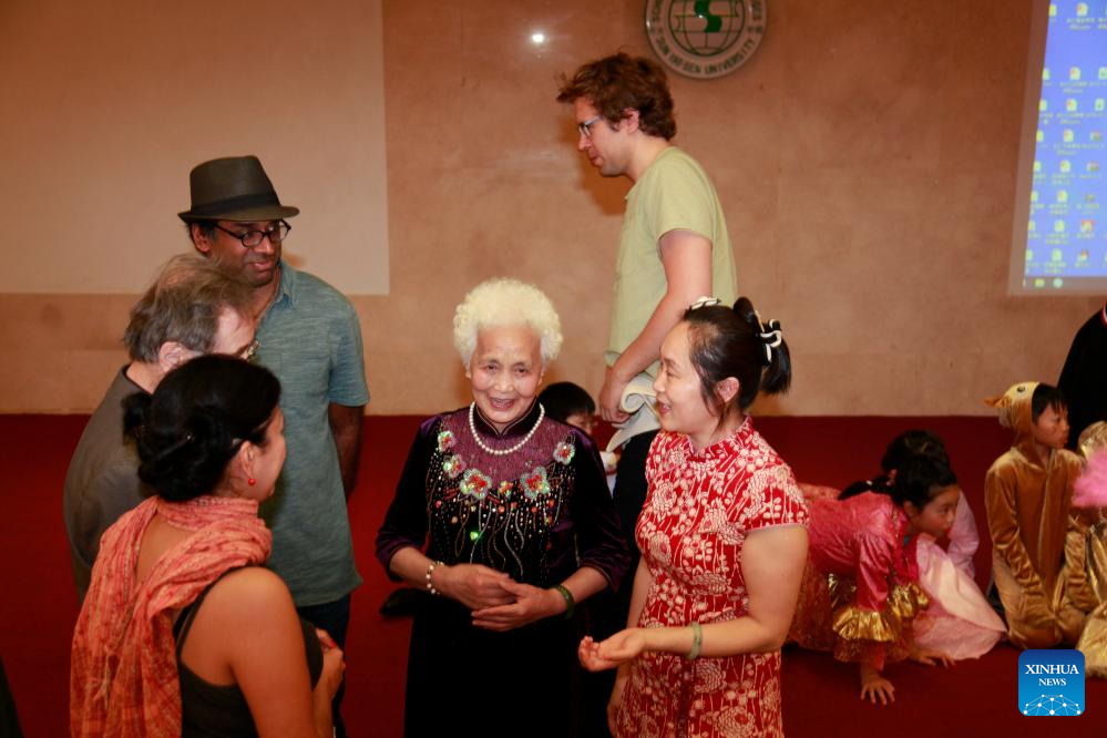 This file photo taken in 2016 shows Jiang Shumei (C) communicating with Chinese and foreign writers during a writing workshop in south China's Guangdong Province.(Xinhua)