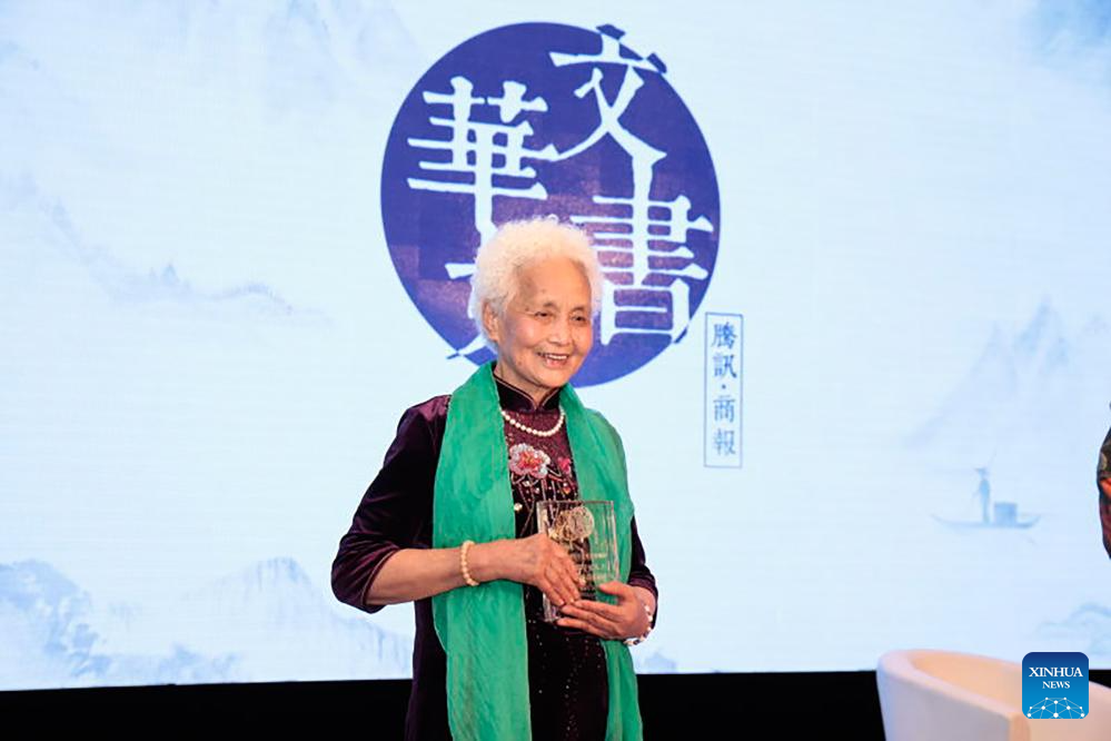 This file photo taken in January 2016 shows Jiang Shumei receiving an award for her third book "The Woman with a Long Neck" in Beijing, capital of China.(Xinhua)