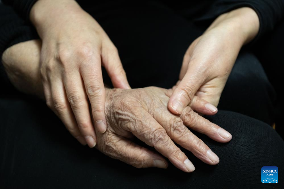 Zhang Ailing, Jiang Shumei's daughter, massages her mother's hand at home in Beilin District of Suihua City, northeast China's Heilongjiang Province, March 5, 2024.(Xinhua/Xie Jianfei)