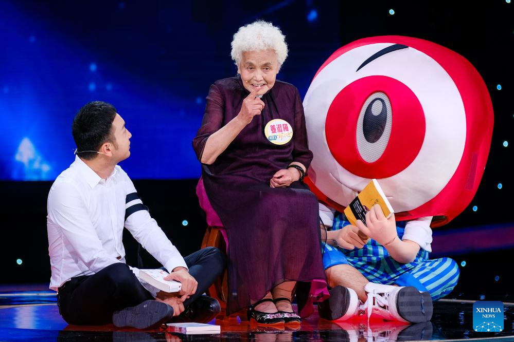 This file photo taken in 2019 shows Jiang Shumei (C) telling stories about herself during a program of China Central Television (CCTV) which aired in September 2019.(Xinhua)