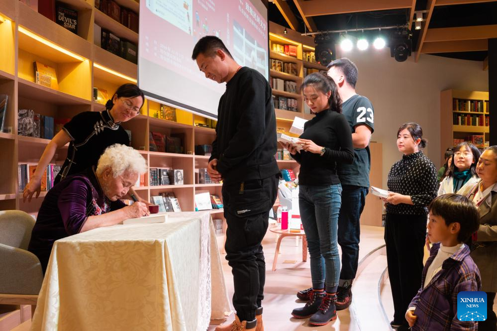 Jiang Shumei signs her autographs for readers during her new book sharing activity in Harbin, northeast China's Heilongjiang Province, Nov. 2, 2019.(Xinhua/Xie Jianfei)