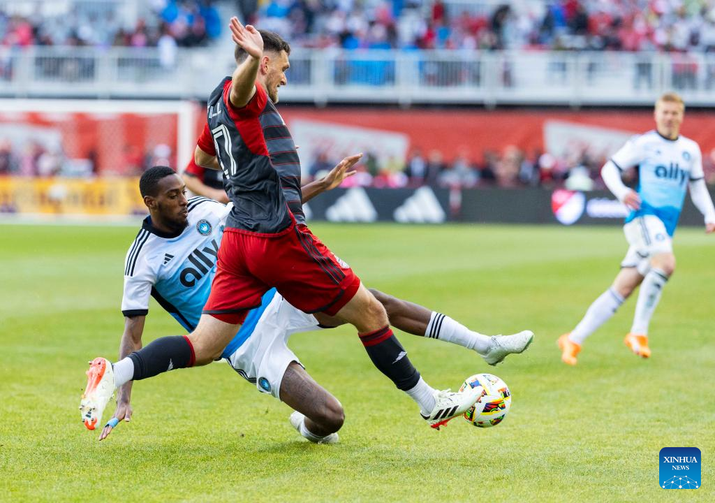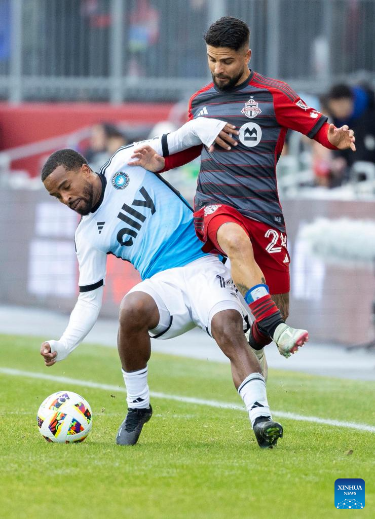 Kobe Franklin (bottom) of Toronto FC vies with Jere Uronen of Charlotte FC during the 2024 Major League Soccer (MLS) match between Toronto FC and Charlotte FC at BMO Field in Toronto, Canada, on March 9, 2024. (Photo by Zou Zheng/Xinhua)