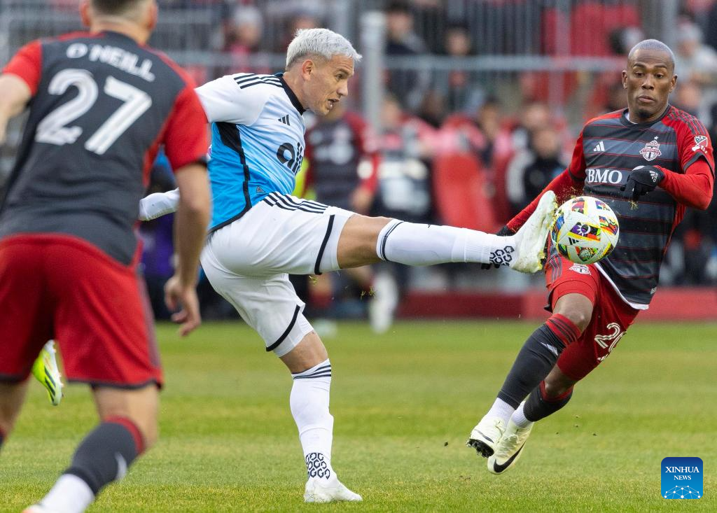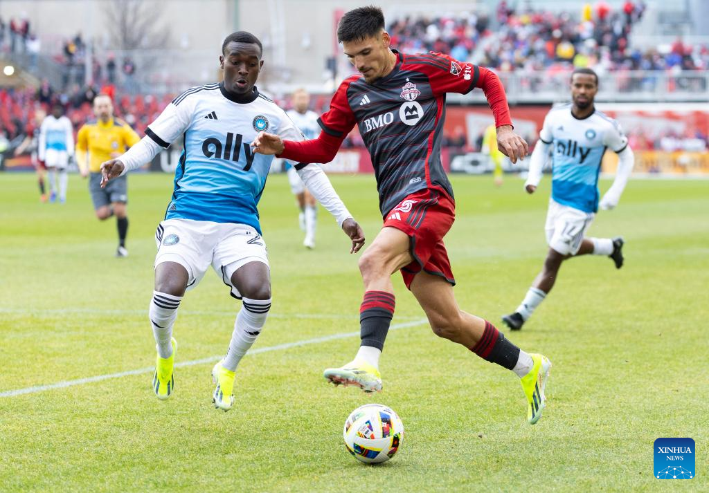 Raoul Petretta (R, front) of Toronto FC breaks through during the 2024 Major League Soccer (MLS) match between Toronto FC and Charlotte FC at BMO Field in Toronto, Canada, on March 9, 2024. (Photo by Zou Zheng/Xinhua)