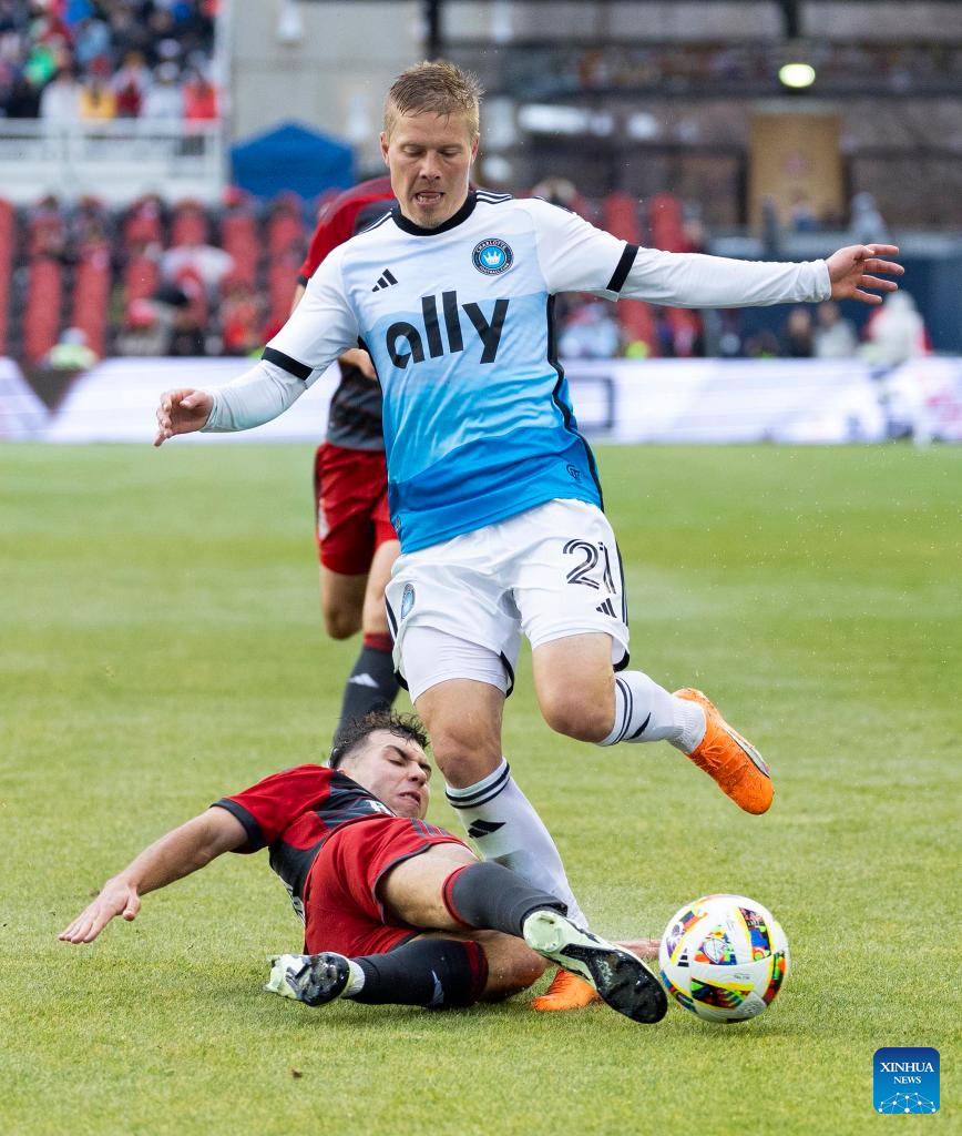 Enzo Copetti (C) of Charlotte FC passes the ball during the 2024 Major League Soccer (MLS) match between Toronto FC and Charlotte FC at BMO Field in Toronto, Canada, on March 9, 2024. (Photo by Zou Zheng/Xinhua)