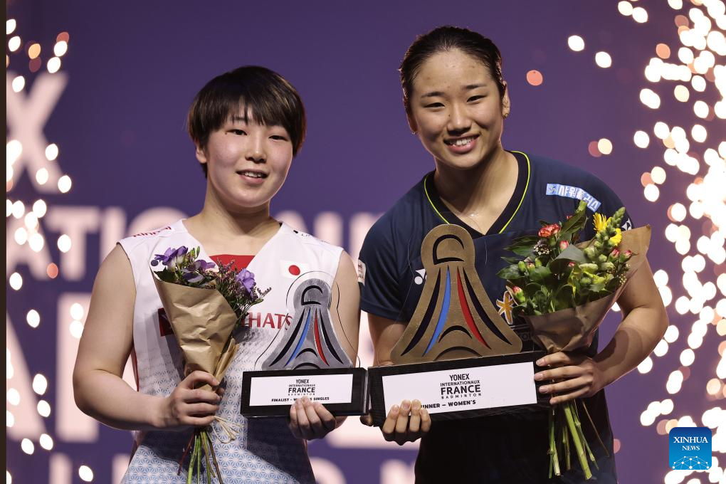 Champion An Se Young (R) of South Korea and runner-up Yamaguchi Akane of Japan pose during the awarding ceremony for the women's singles event at French Open Badminton tournament in Paris, France, March 10, 2024. (Photo by Aurelien Morissard/Xinhua)