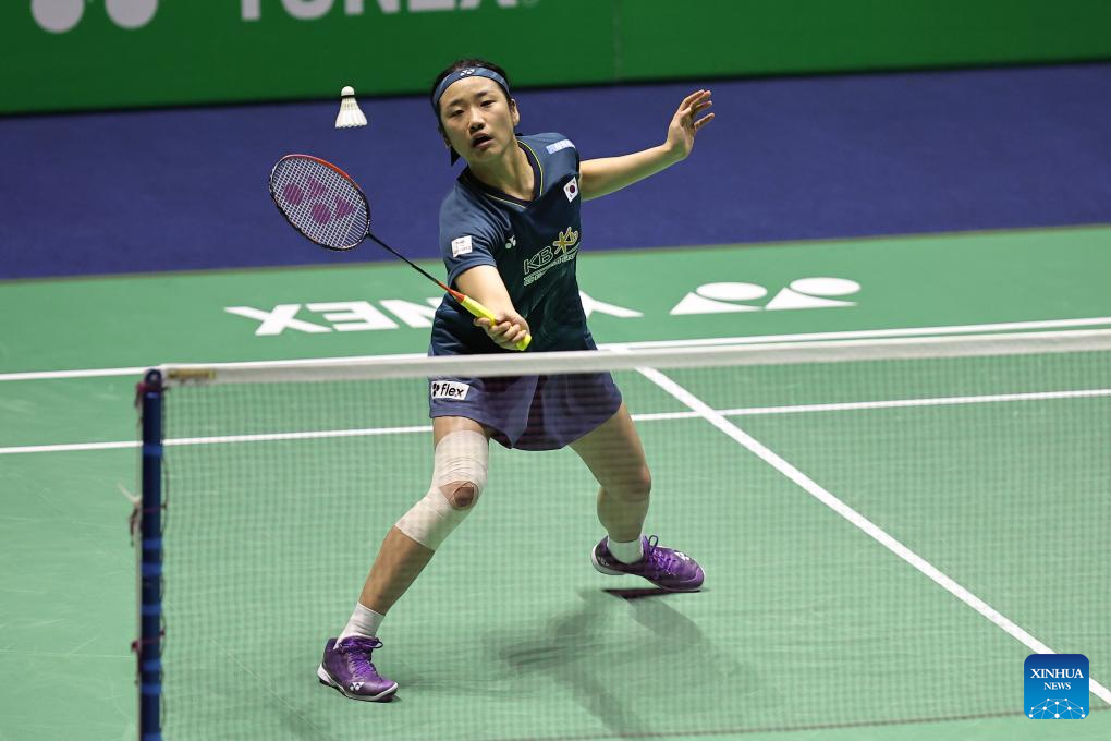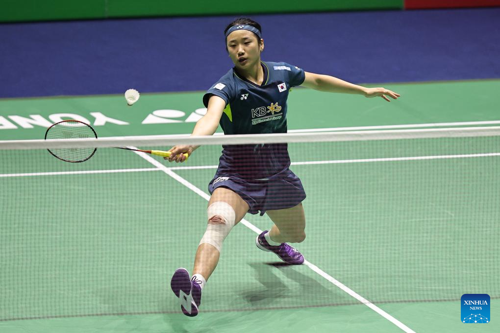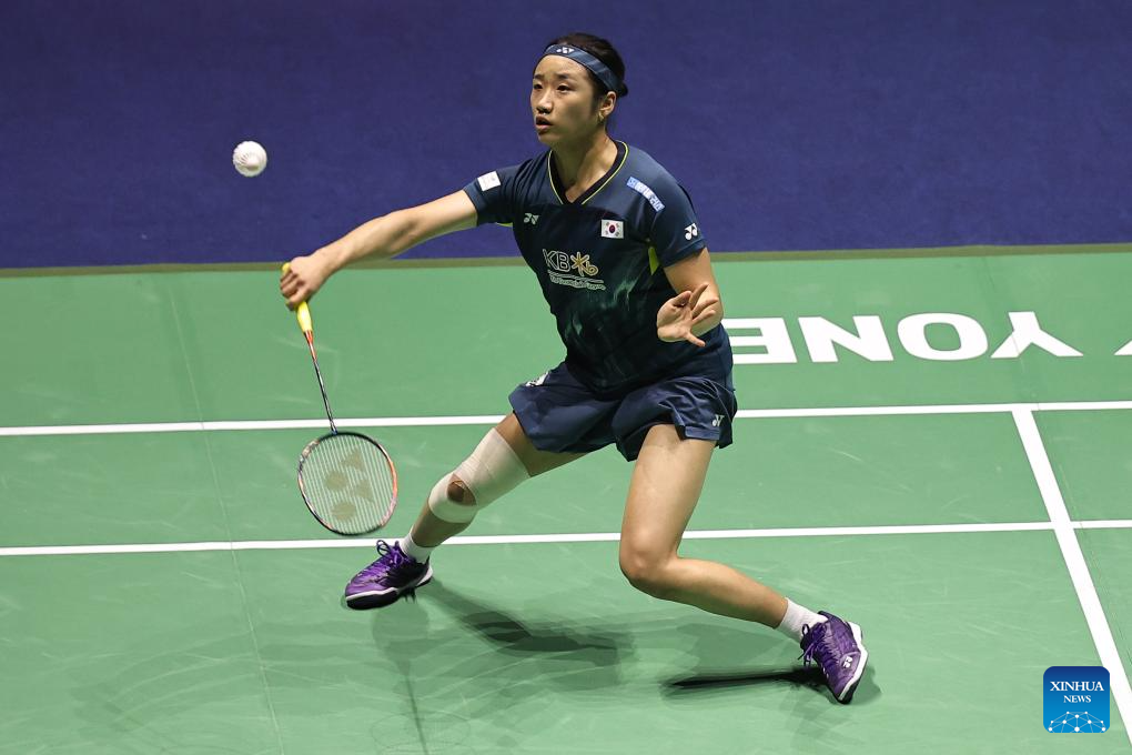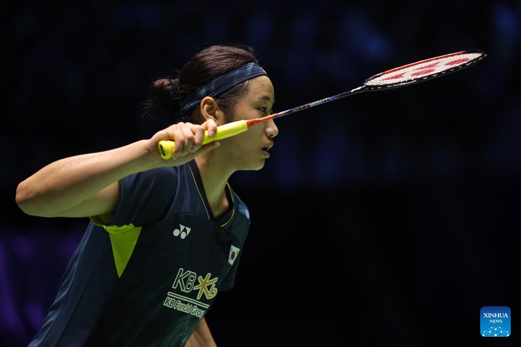An Se Young of South Korea hits a return during the women's singles final match against Yamaguchi Akane of Japan at French Open Badminton tournament in Paris, France, March 10, 2024. (Photo by Aurelien Morissard/Xinhua)