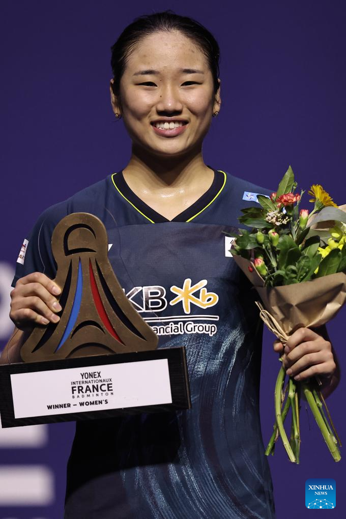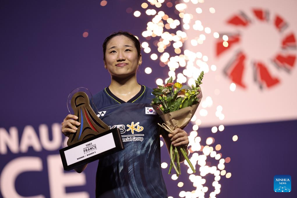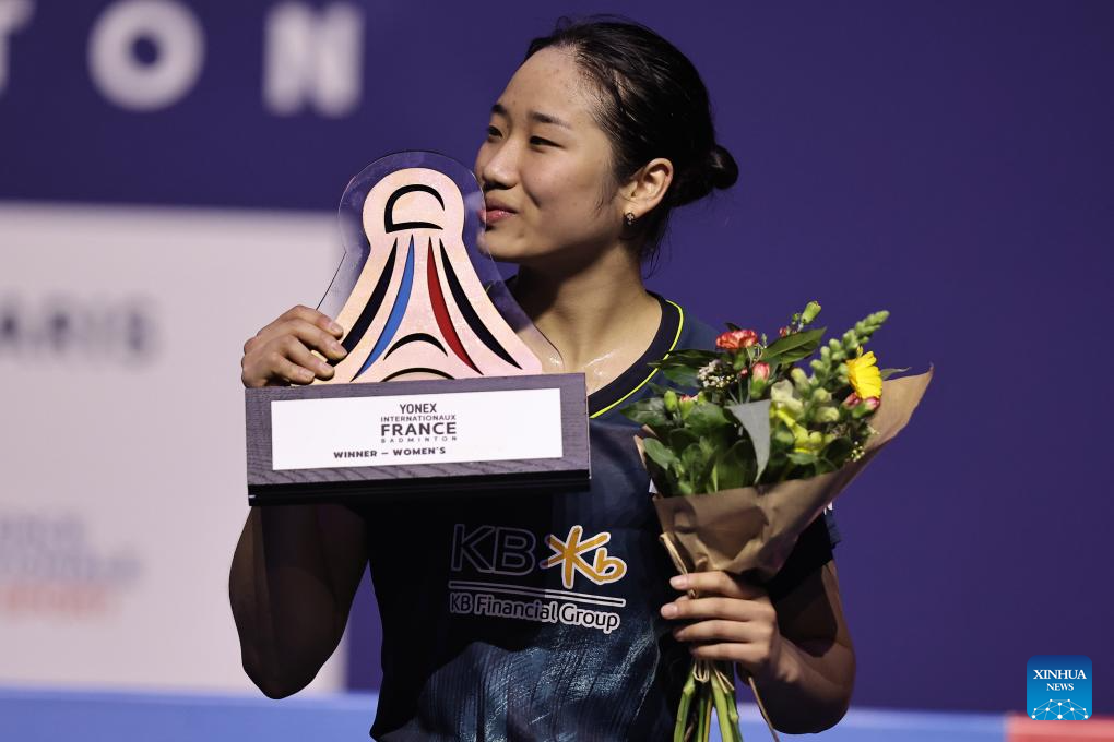Champion An Se Young of South Korea celebrates during the awarding ceremony for the women's singles event at French Open Badminton tournament in Paris, France, March 10, 2024. (Photo by Aurelien Morissard/Xinhua)