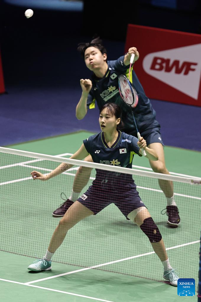 Seo Seung Jae/Chae Yu Jung(front) of South Korea compete during the mixed doubles final match against Feng Yanzhe/Huang Dongping of China at the French Open Badminton tournament in Paris, France, March 10, 2024. (Photo by Aurelien Morissard/Xinhua)