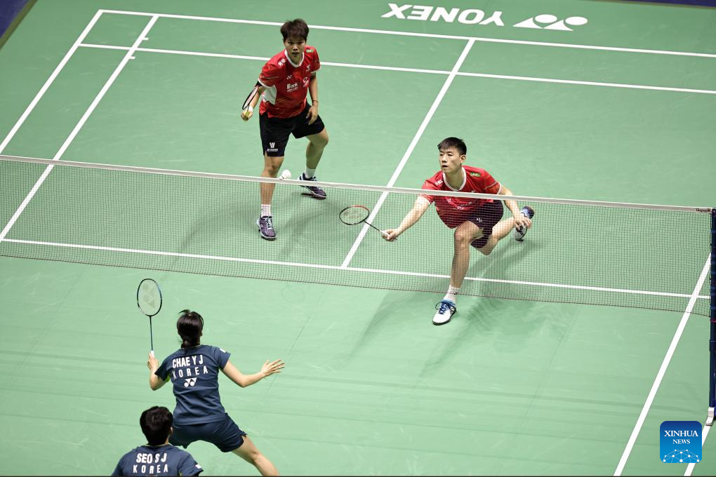 Feng Yanzhe(top L)/Huang Dongping(top R) of China compete during the mixed doubles final match against Seo Seung Jae/Chae Yu Jung of South Korea at the French Open Badminton tournament in Paris, France, March 10, 2024. (Photo by Aurelien Morissard/Xinhua)