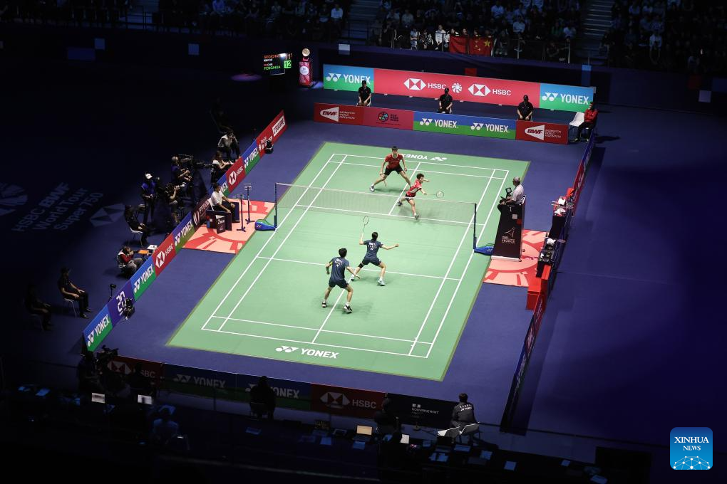 Feng Yanzhe(top R)/Huang Dongping(top L) of China compete during the mixed doubles final match against Seo Seung Jae/Chae Yu Jung of South Korea at the French Open Badminton tournament in Paris, France, March 10, 2024. (Photo by Aurelien Morissard/Xinhua)
