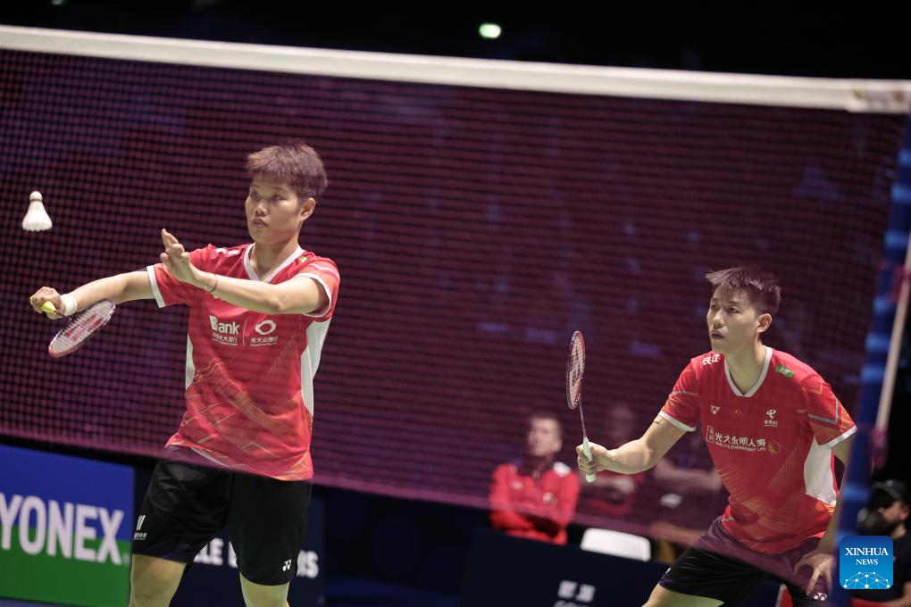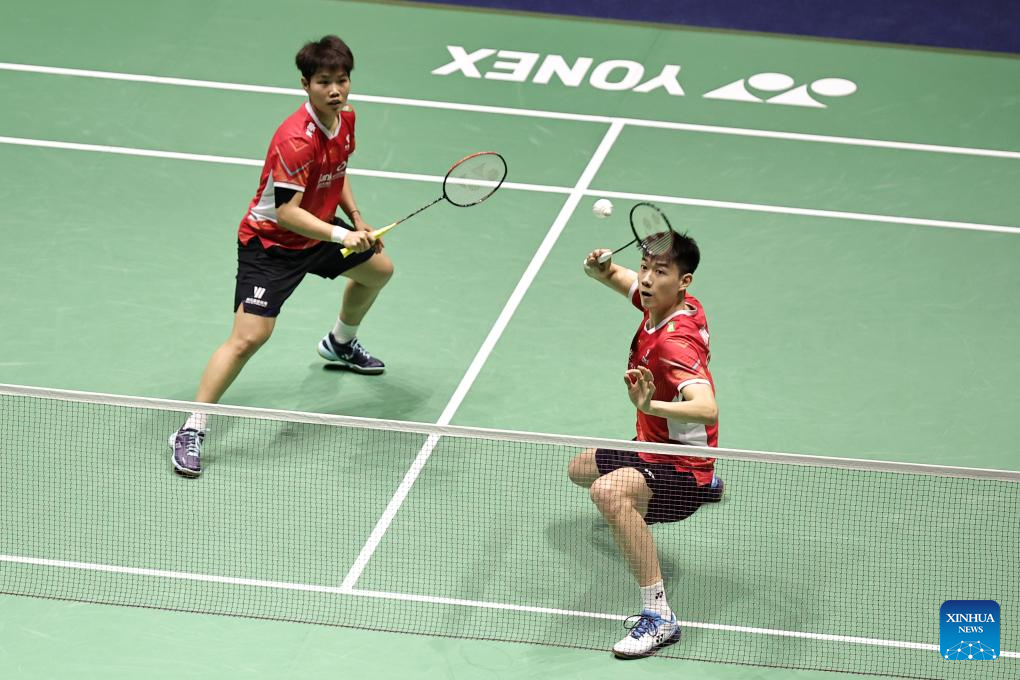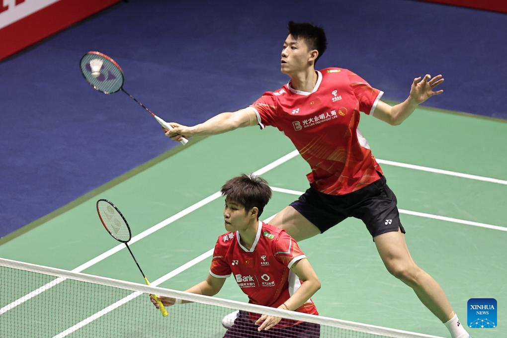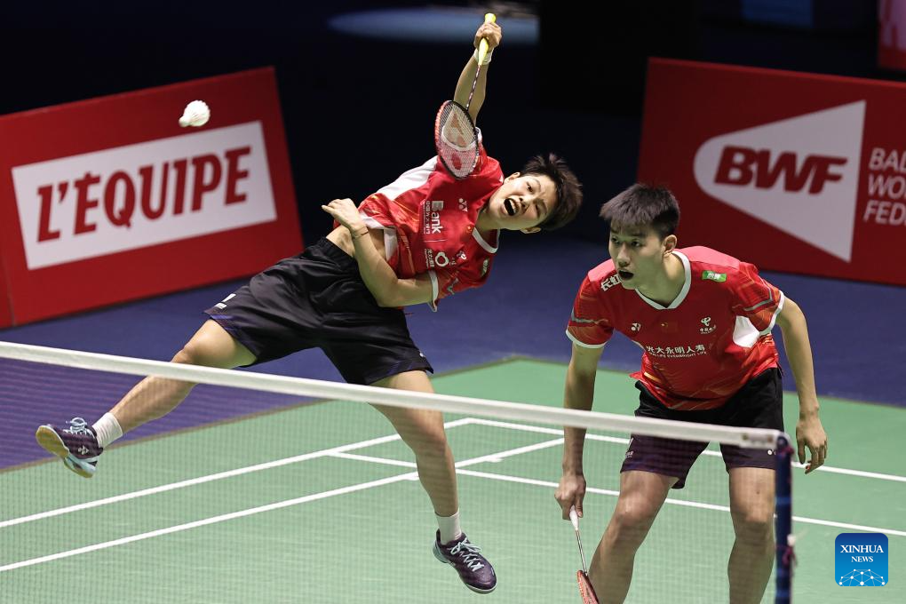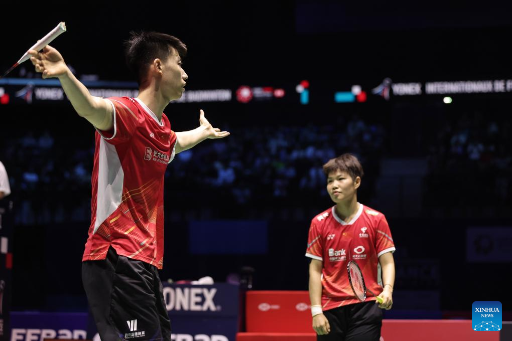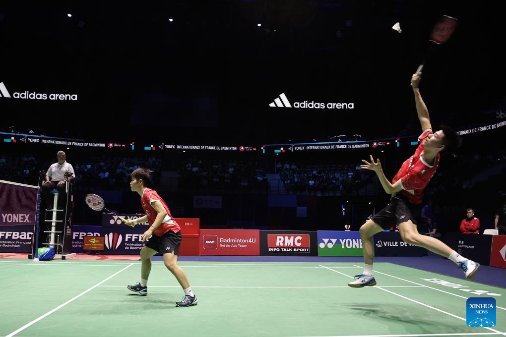 Feng Yanzhe/Huang Dongping(L) of China compete during the mixed doubles final match against Seo Seung Jae/Chae Yu Jung of South Korea at the French Open Badminton tournament in Paris, France, March 10, 2024. (Photo by Aurelien Morissard/Xinhua)