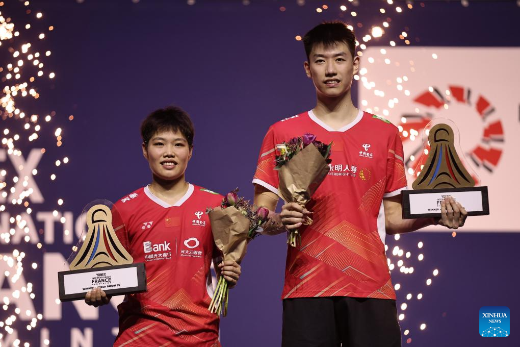 Champions Feng Yanzhe(R)/Huang Dongping of China pose during the awarding ceremony for the mixed doubles event at the French Open Badminton tournament in Paris, France, March 10, 2024. (Photo by Aurelien Morissard/Xinhua)