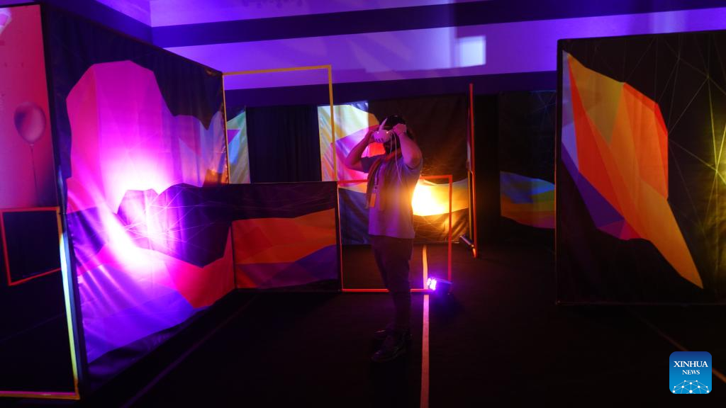A visitor tries interactive devices during an extended reality (XR) experience exhibition of South by Southwest (SXSW) Conference and Festivals in Austin, Texas, the United States, March 10, 2024. (Xinhua/Xu Jianmei)
