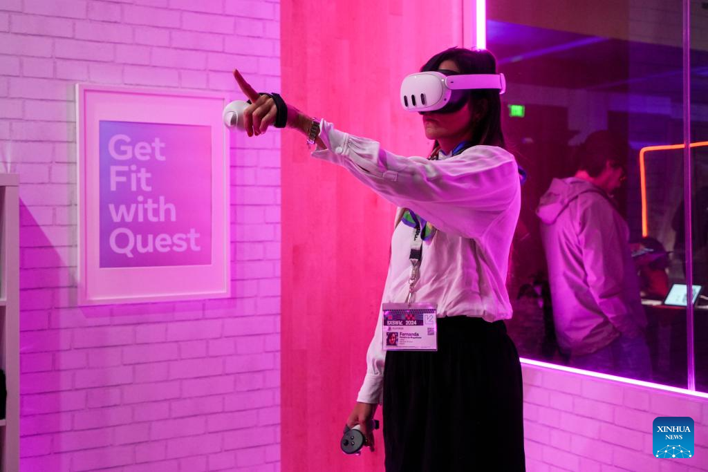 A visitor tries VR devices during an extended reality (XR) experience exhibition of South by Southwest (SXSW) Conference and Festivals in Austin, Texas, the United States, March 10, 2024. (Photo by Bo Lee/Xinhua)