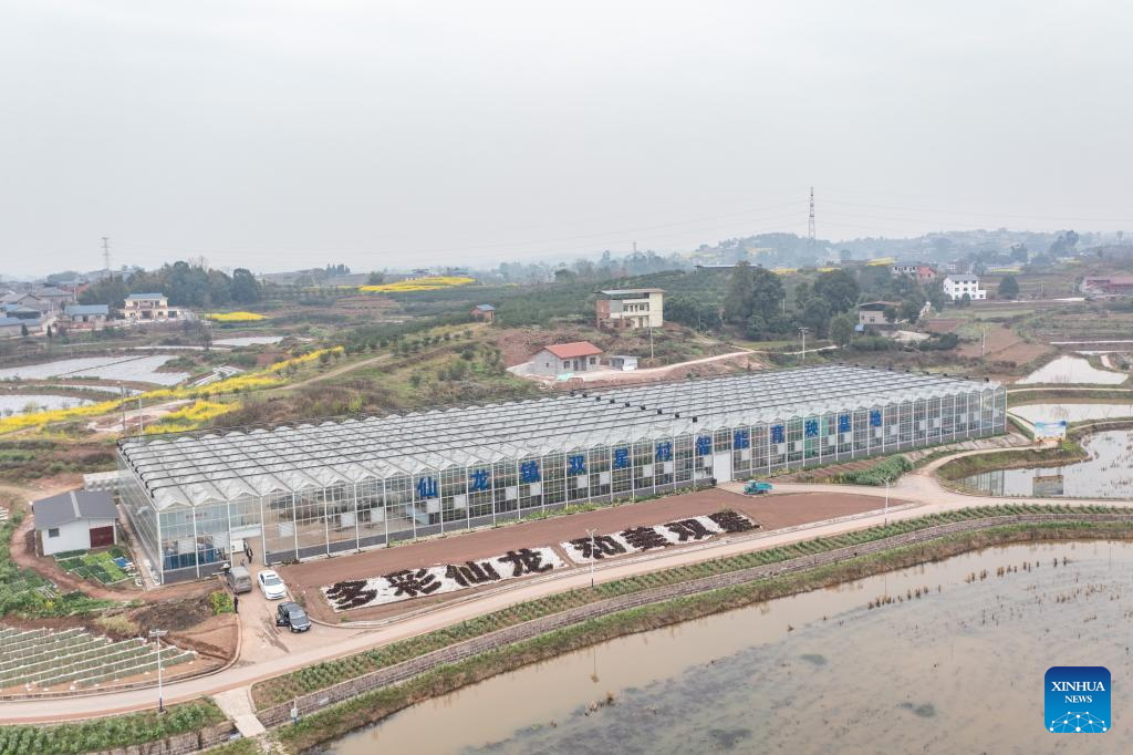 An aerial drone photo shows an intelligent seedling breeding base in Shuangxing Village of Xianlong Town, southwest China's Chongqing, March 12, 2024. With a total area of 4,608 square meters, the intelligent seedling breeding base yields 12,000 mu (about 800 hectares) of rice seedlings per year. (Xinhua/Huang Wei)