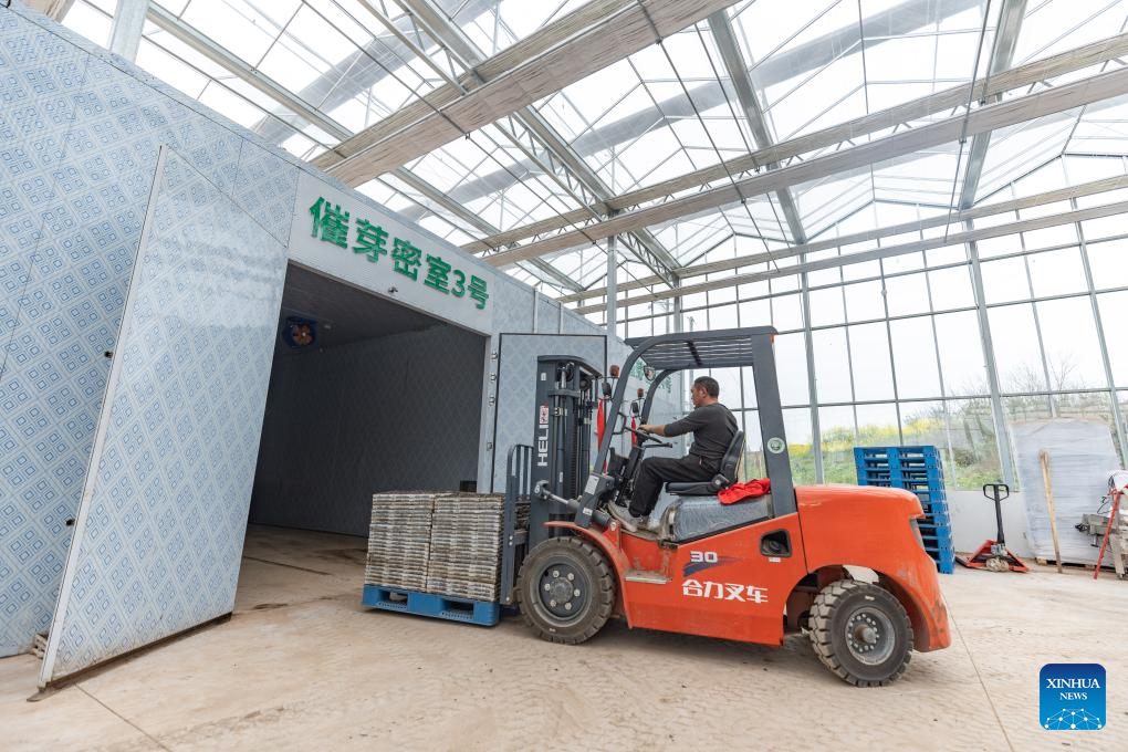 A worker transports seedling trays at an intelligent seedling breeding base in Shuangxing Village of Xianlong Town, southwest China's Chongqing, March 12, 2024. With a total area of 4,608 square meters, the intelligent seedling breeding base yields 12,000 mu (about 800 hectares) of rice seedlings per year. (Xinhua/Huang Wei)