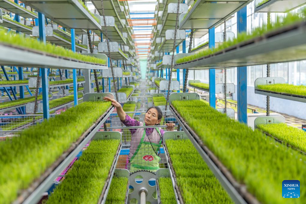 A worker checks the growth of seedlings at an intelligent seedling breeding base in Shuangxing Village of Xianlong Town, southwest China's Chongqing, March 12, 2024. With a total area of 4,608 square meters, the intelligent seedling breeding base yields 12,000 mu (about 800 hectares) of rice seedlings per year. (Xinhua/Huang Wei)