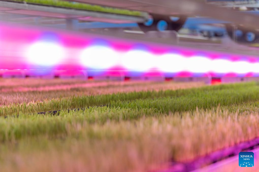 This photo shows seedlings at an intelligent seedling breeding base in Shuangxing Village of Xianlong Town, southwest China's Chongqing, March 12, 2024. With a total area of 4,608 square meters, the intelligent seedling breeding base yields 12,000 mu (about 800 hectares) of rice seedlings per year. (Xinhua/Huang Wei)