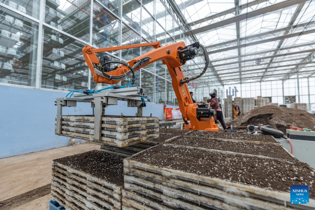 A robot carries seedling trays at an intelligent seedling breeding base in Shuangxing Village of Xianlong Town, southwest China's Chongqing, March 12, 2024. With a total area of 4,608 square meters, the intelligent seedling breeding base yields 12,000 mu (about 800 hectares) of rice seedlings per year. (Xinhua/Huang Wei)