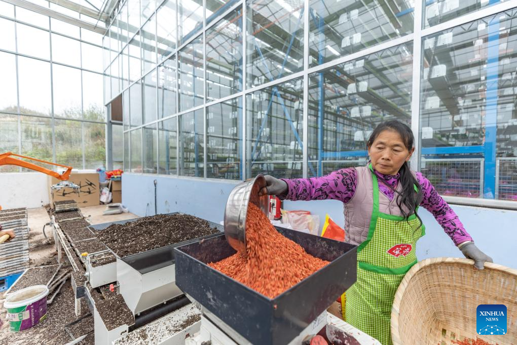 A worker pours rice seeds at an intelligent seedling breeding base in Shuangxing Village of Xianlong Town, southwest China's Chongqing, March 12, 2024. With a total area of 4,608 square meters, the intelligent seedling breeding base yields 12,000 mu (about 800 hectares) of rice seedlings per year. (Xinhua/Huang Wei)