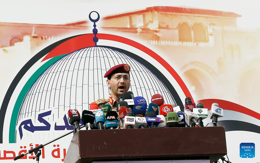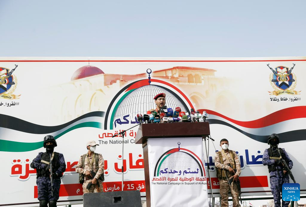 Houthi military spokesman Yahya Sarea (C) makes a statement during a rally in Sanaa, Yemen, on March 15, 2024. Yemen's armed Houthi forces said on Friday that they have launched fresh attacks targeting an Israeli ship and a U.S. warship in the Red Sea. (Photo by Mohammed Mohammed/Xinhua)