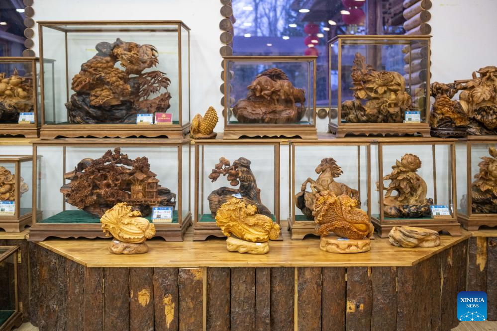 Wooden artworks are pictured at an exhibition hall in Yichun, northeast China's Heilongjiang Province, March 12, 2024. The city of Yichun has capitalized on its abundant forestry resources to drive the development of woodcraft industry in recent years. It has made efforts to improve carving skills of practitioners, nurture talent and expand brand influence to boost local economic growth. (Xinhua/Xie Jianfei)