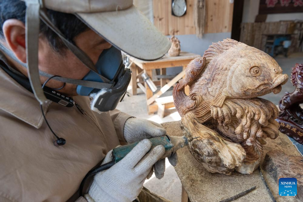 A staff member carves a component of a wooden artwork at a workshop in Yichun, northeast China's Heilongjiang Province, March 14, 2024. The city of Yichun has capitalized on its abundant forestry resources to drive the development of woodcraft industry in recent years. It has made efforts to improve carving skills of practitioners, nurture talent and expand brand influence to boost local economic growth. (Xinhua/Xie Jianfei)