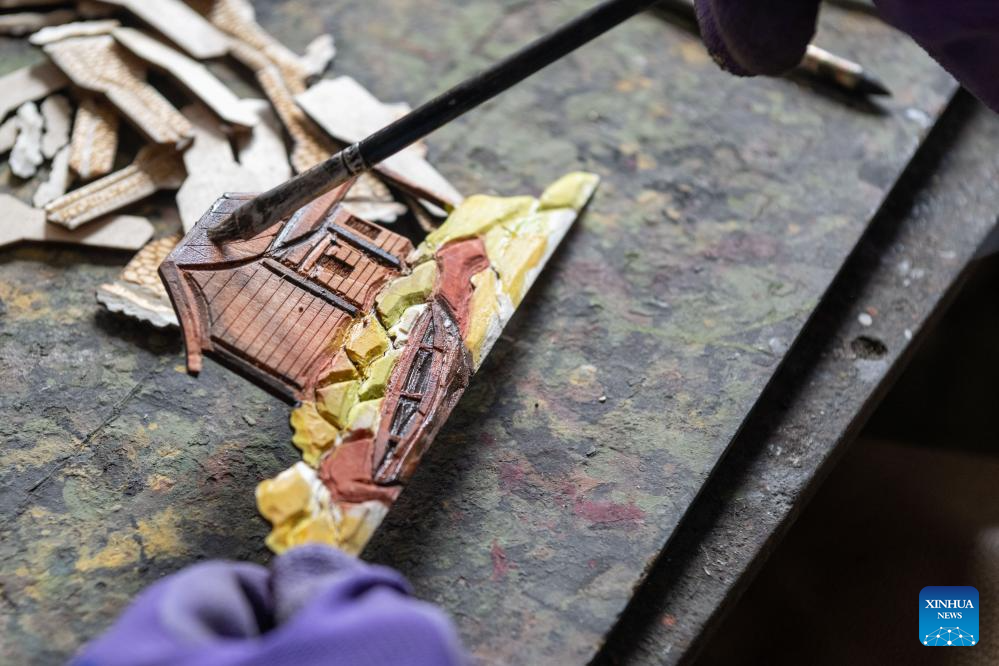 A staff member colors a component of a wooden artwork at a workshop in Yichun, northeast China's Heilongjiang Province, March 14, 2024. The city of Yichun has capitalized on its abundant forestry resources to drive the development of woodcraft industry in recent years. It has made efforts to improve carving skills of practitioners, nurture talent and expand brand influence to boost local economic growth. (Xinhua/Xie Jianfei)