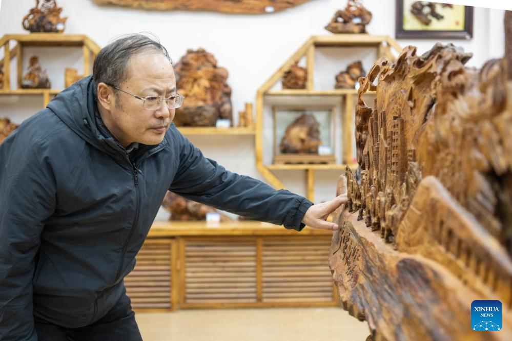 Handicraftsman Wang Meijiang views the artwork he designed in Yichun, northeast China's Heilongjiang Province, March 12, 2024. The city of Yichun has capitalized on its abundant forestry resources to drive the development of woodcraft industry in recent years. It has made efforts to improve carving skills of practitioners, nurture talent and expand brand influence to boost local economic growth. (Xinhua/Xie Jianfei)