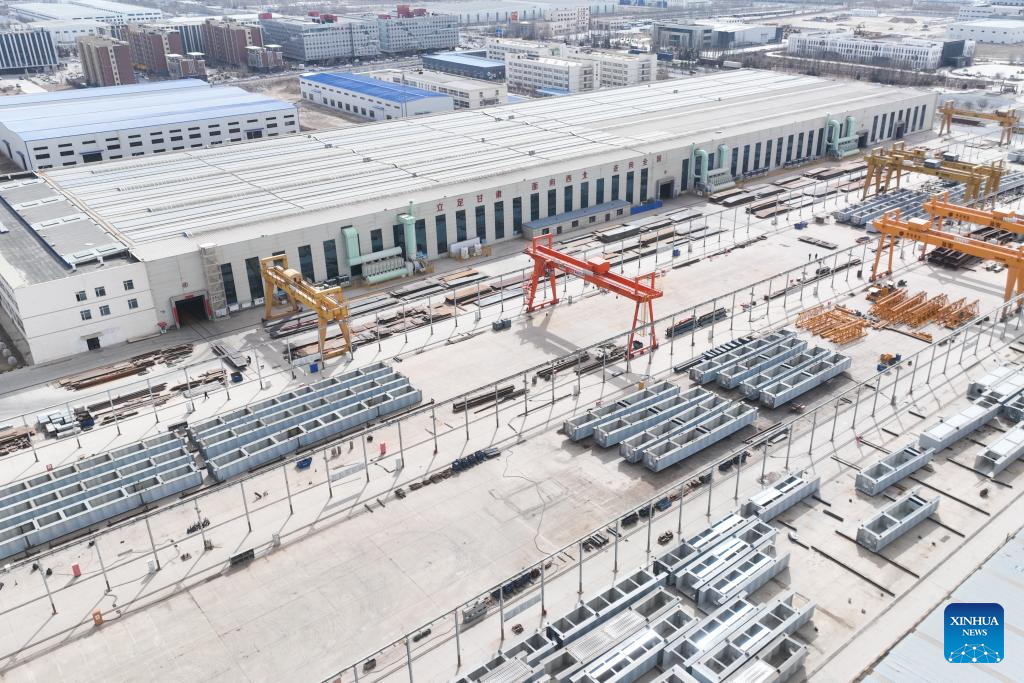 An aerial drone photo taken on March 14, 2024 shows a workshop of Gansu Bori Traffic Heavy Equipment Manufacturing Co., Ltd. in Lanzhou New Area of Lanzhou, northwest China's Gansu Province.