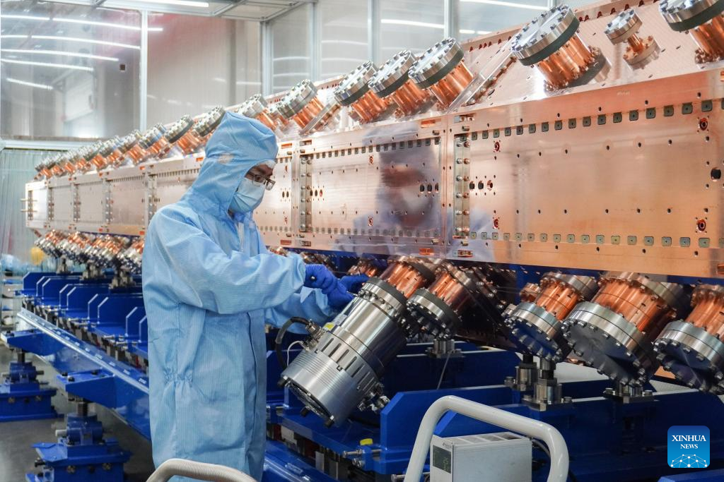 A staff member processes components of medical machines in Lanzhou Ion Therapy Co., Ltd. in Lanzhou New Area of Lanzhou, northwest China's Gansu Province, March 14, 2024.