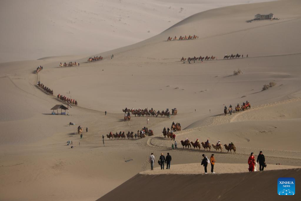 Tourists ride camels at the Mingsha Mountain and Crescent Spring scenic spot in Dunhuang, northwest China's Gansu Province, March 16, 2024. Dunhuang has received a total of 336,000 tourists from Jan. 1 to March 16 this year, an increase of 86.6 percent over the same period in 2023. (Xinhua/Zhang Zhimin)