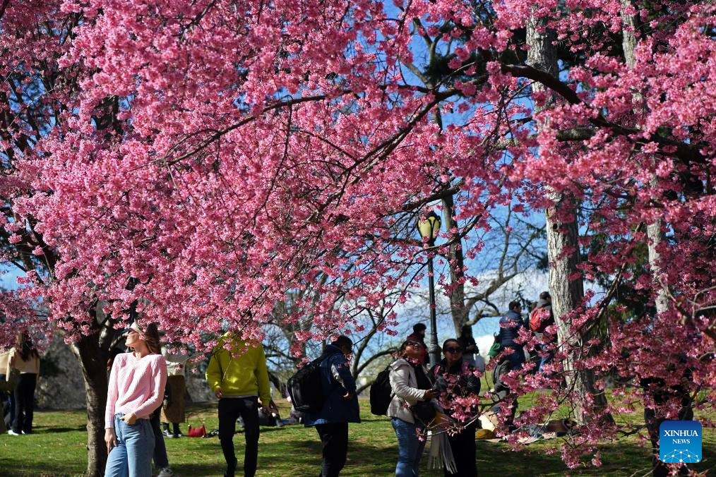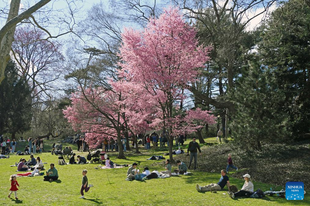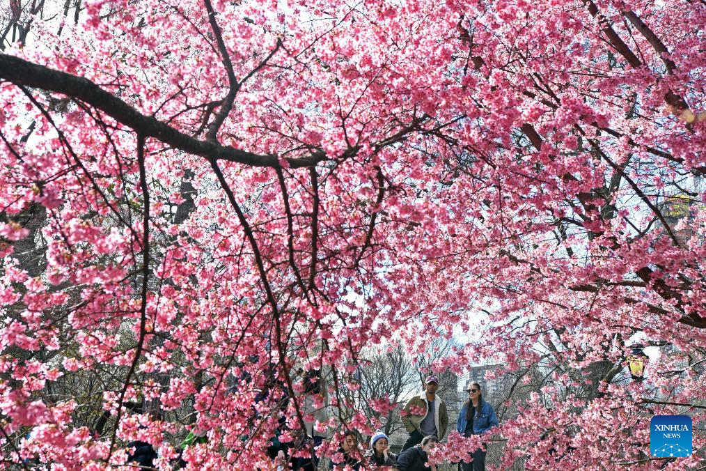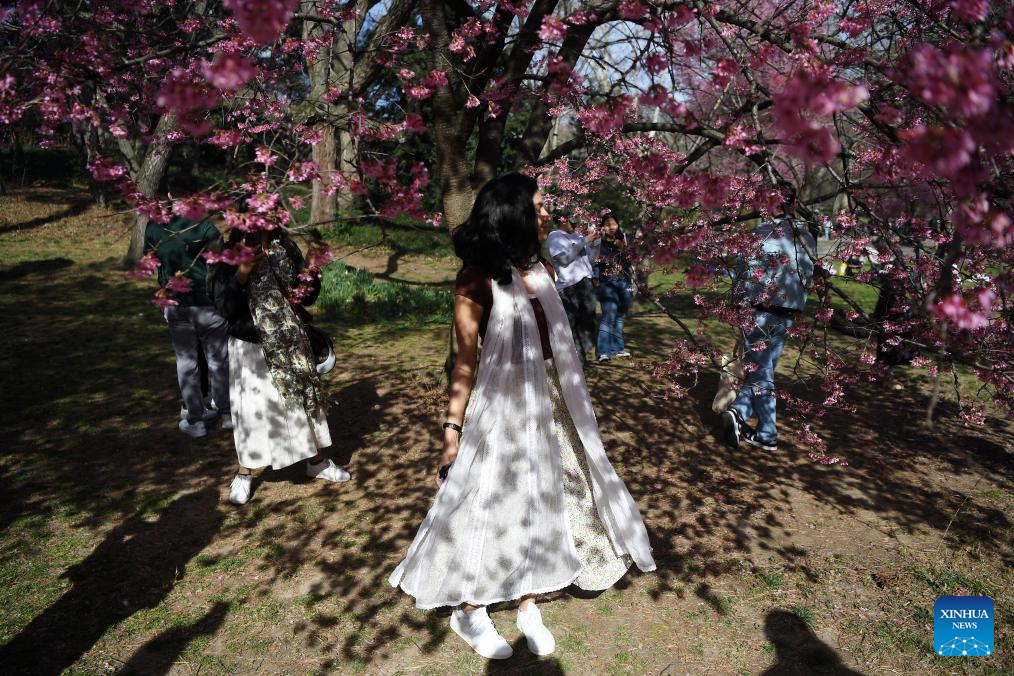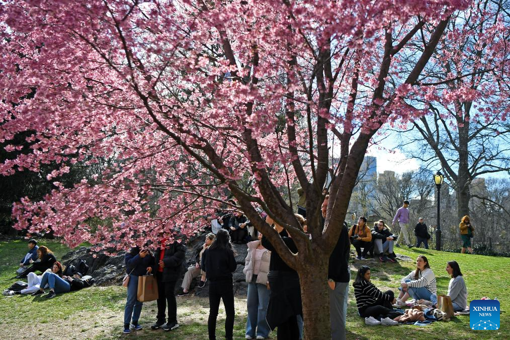 People spend time around cherry blossoms at Central Park in New York, the United States, on March 17, 2024. (Xinhua/Li Rui)