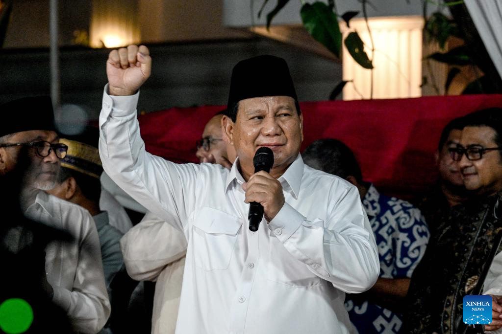 Prabowo Subianto speaks at a gathering with media and his supporters in Jakarta, Indonesia, on March 20, 2024. Presidential and vice-presidential candidate pair Prabowo Subianto and Gibran Rakabuming Raka won Indonesia's 2024 presidential election, the country's General Elections Commission (KPU) announced on Wednesday. (Xinhua/Agung Kuncahya B.)
