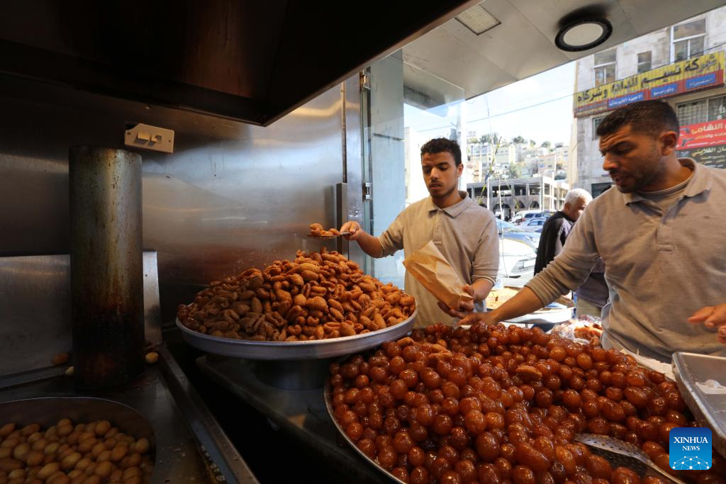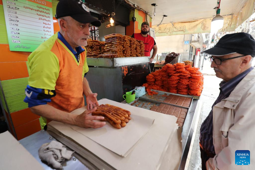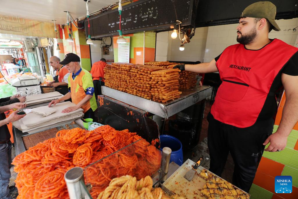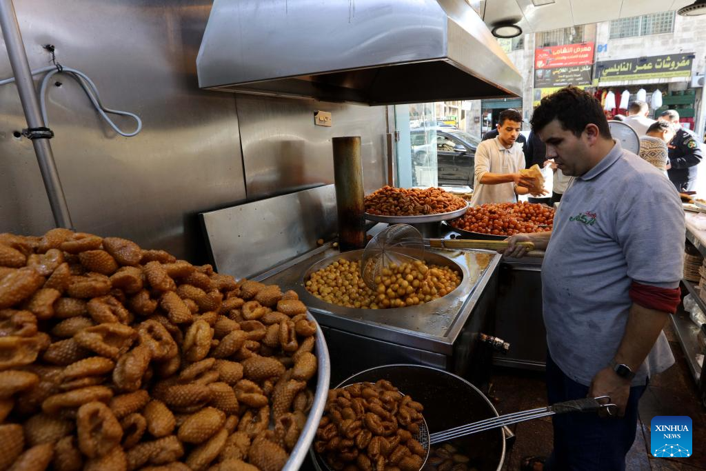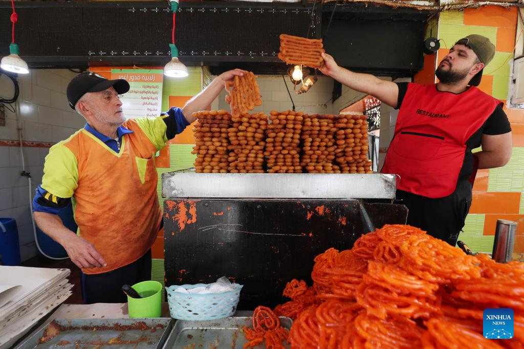 People prepare sweets at a market during Ramadan in Amman, Jordan, on March 20, 2024. (Photo by Mohammad Abu Ghosh/Xinhua)