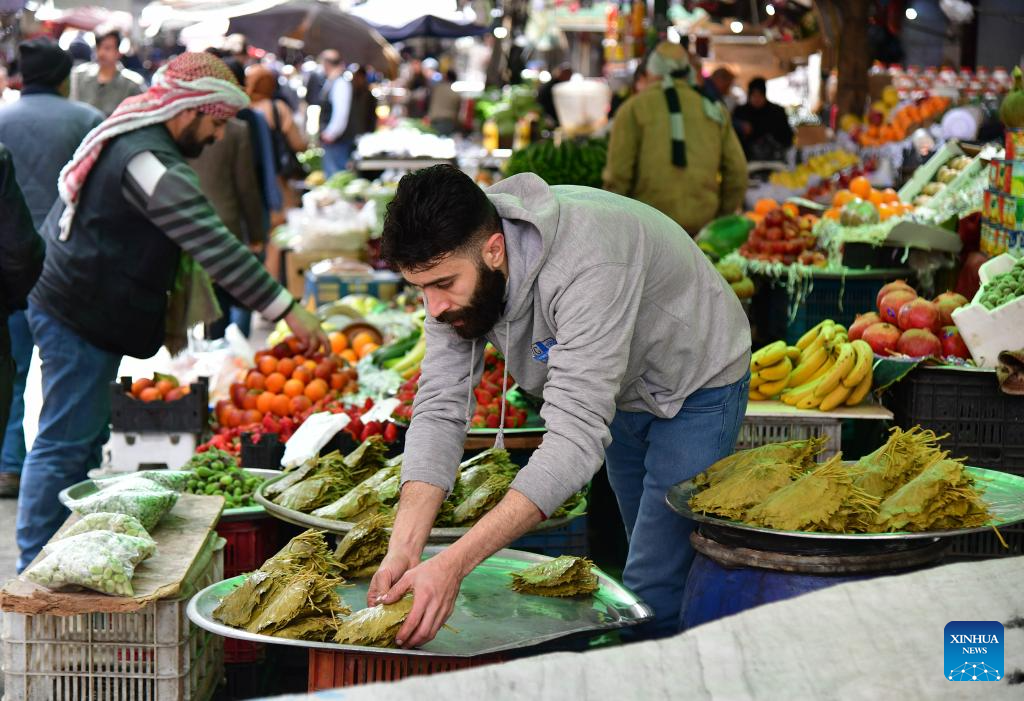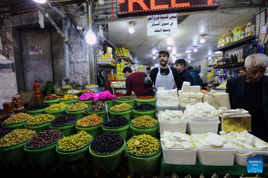 A seller arranges groceries at a market during Ramadan in Damascus, Syria, on March 20, 2024. (Photo by Ammar Safarjalani/Xinhua)