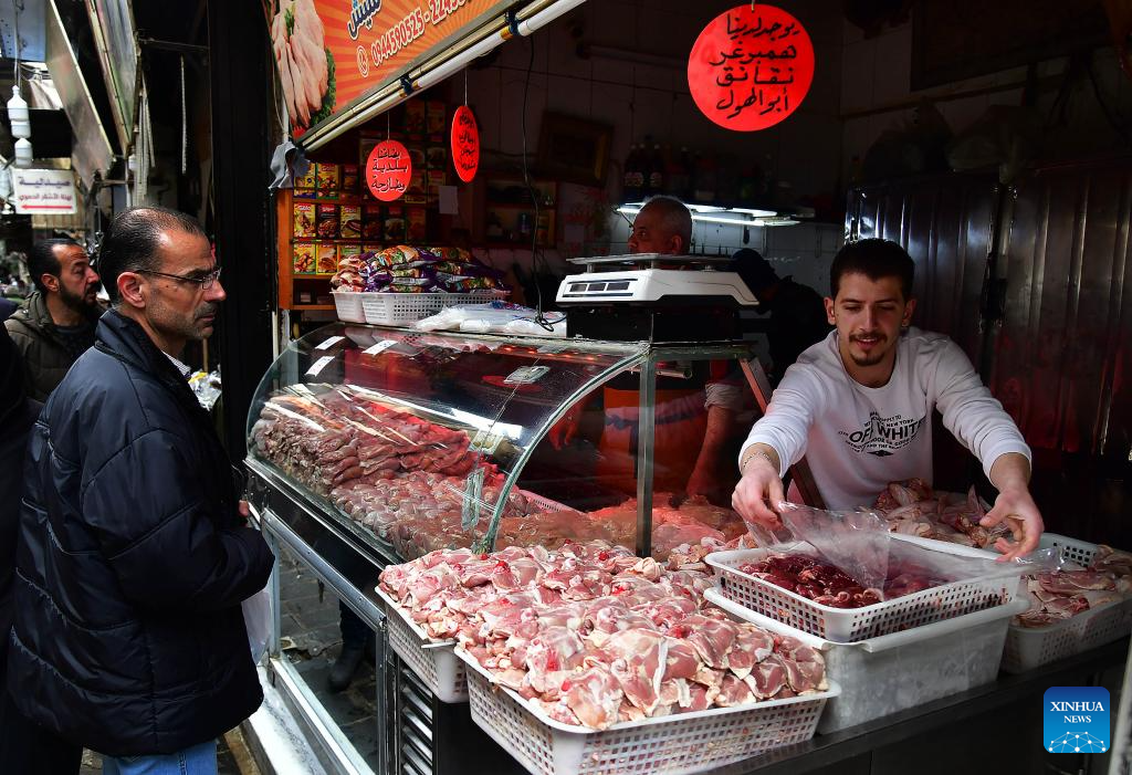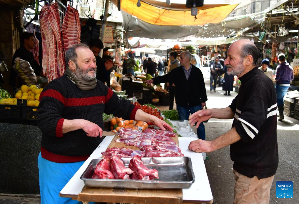 A man sells meat at a market during Ramadan in Damascus, Syria, on March 20, 2024. (Photo by Ammar Safarjalani/Xinhua)