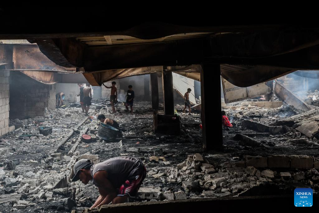 Residents return to their charred homes to search for their belongings after a fire at a slum area in Manila, the Philippines, March 22, 2024. A fire broke out Thursday night, razing about 140 homes, according to the Philippine Bureau of Fire Protection. (Xinhua/Rouelle Umali)